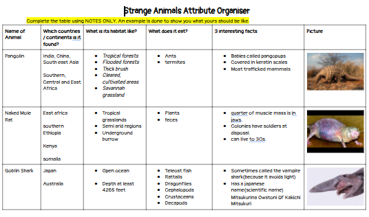 Term we started a literacy theme called strange animals. one of the activity we had to do was attribute about the strangest animals on earth. the activity is based around things like what country/continent its found in, what its habitat is like and what it eats. i had to research every little detail about every strange animal. If you would like to see our other tasks you can go to our Kotuku website